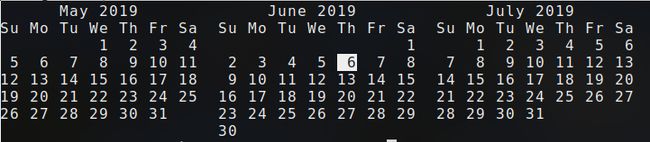 El comando muestra un calendario con el mes anterior, el actual y el mes siguiente.