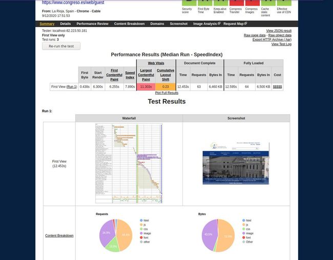 He probado a hacer un nuevo test con webpagetest y los resultados son similares. La mayoría del tiempo se va cargando el javascript y las imágenes.