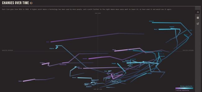 Webpack va hacia abajo en satisfacción, aunque todavía se usa mucho. Express y React más de lo mismo. Lo de React supongo que será por el hype que hay con Solid y Next. Gulp y Ember condenados a morir. Curioso que Vue baje en satisfacción. Svelte cada vez con mejores opiniones.