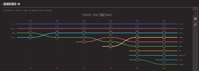 Respecto a otros lenguajes, para sorpresa de nadie Typescript lo más usado seguido de Elm. A ver si se promocionan más los lenguajes funcionales que compilan a Javascript, por aquello de tener más variedad.