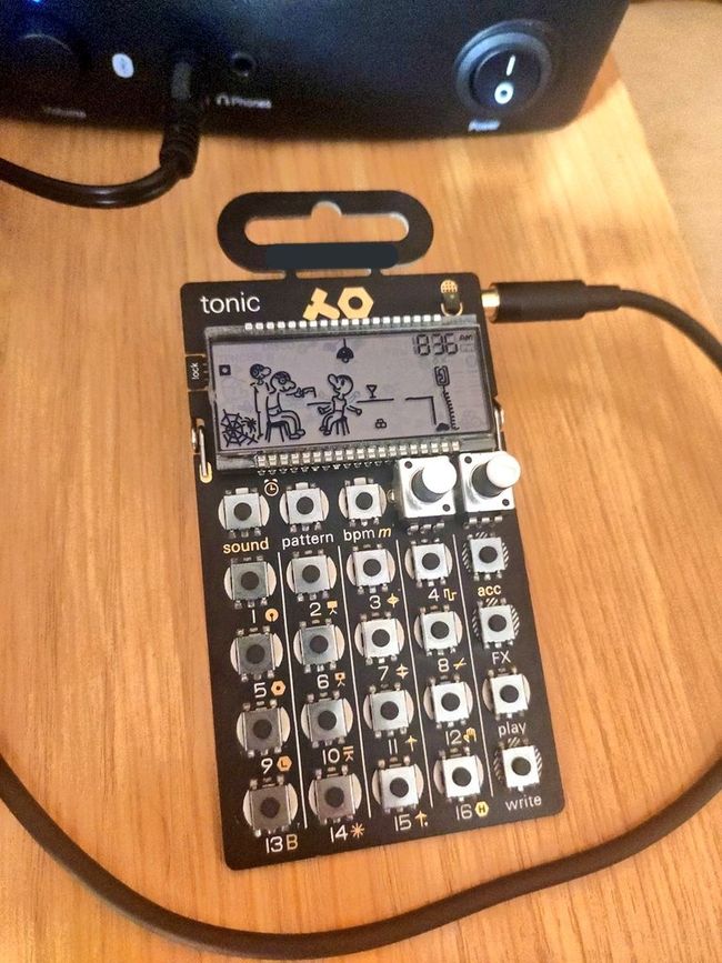 Por si alguien se ha quedado con la duda, es una Pocket Operator Po 32 tonic, una maquinita muy barata para generar ritmos de percusión (drum machine).