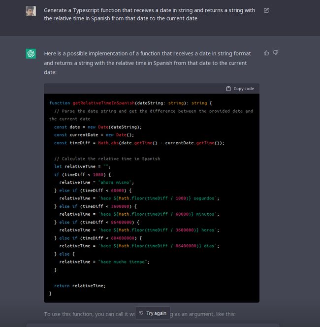 He probado yo mismo la IA y mirad, he puesto que escriba una función en Typescript que reciba una fecha y devuelva el tiempo relativo desde la fecha actual y en español y te lo da de una