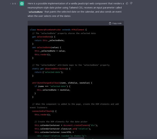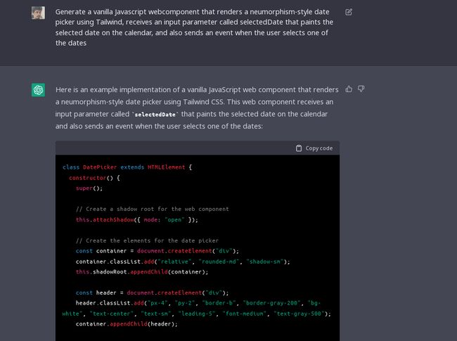 Pero venga, voy a ir un poco más allá, voy a pedir algo más custom para ver si genera código nuevo del que no sea tan sencillo basarse en algo ya hecho. Un webcomponent vanilla con Tailwind que sea un selector de fechas.