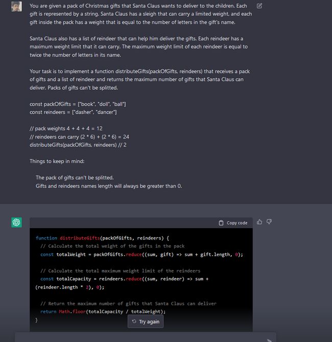 Vale, esto si que es de locos, he pedido que resuelva el ejercicio del AdventJS de @midudev y lo hace bien a la primera. Es cierto que la implementación podría ser algo mejor, pero esto ya me parece brutal.